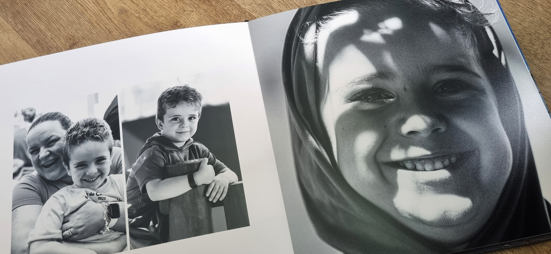 Ele possui capa dura com foto e o miolo é feito em papel fotográfico linho com folhas rígidas.