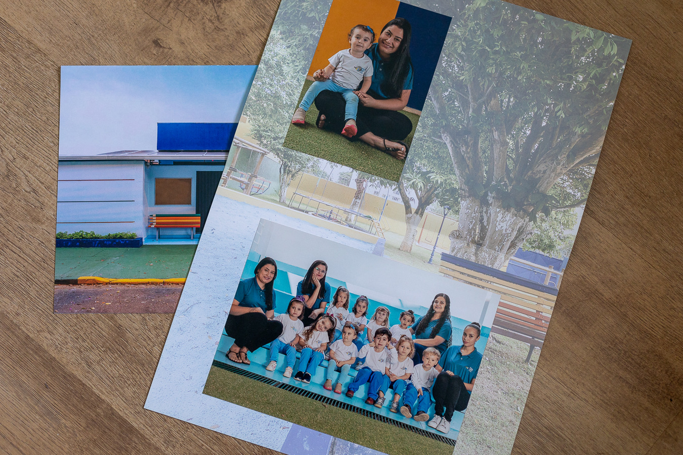 Foto da criança com a professora + foto geral da classe coladas em folder impresso em papel couche 300g.