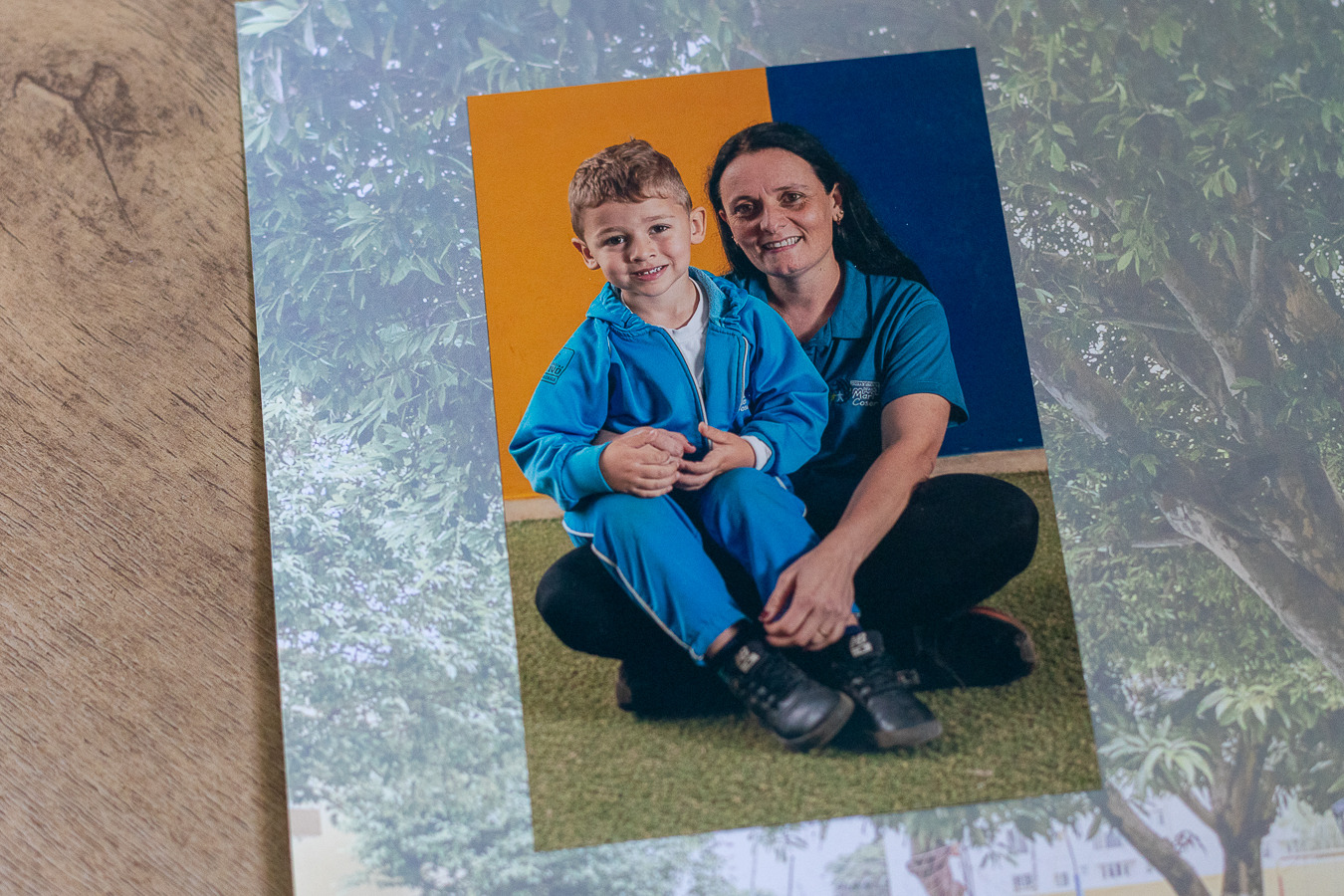 A foto recordação é a tradicional foto da classe e mais uma foto da criança com sua professora.