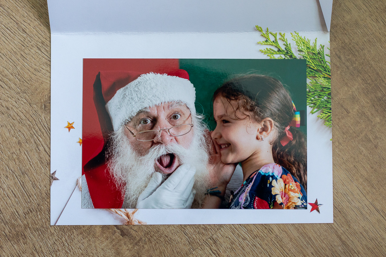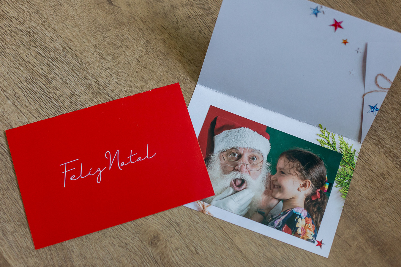 Foto da sua criança com o Papai Noel colada em cartão de Natal impresso em papel couche fosco 300g.